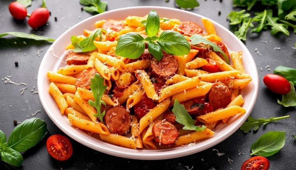 Em um refratário untado acomode a massa já cozida,cubra com o molho de tomate, linguiça, queijo ,rodelas de tomate ,folhas de manjericão e polvilhe orégano.